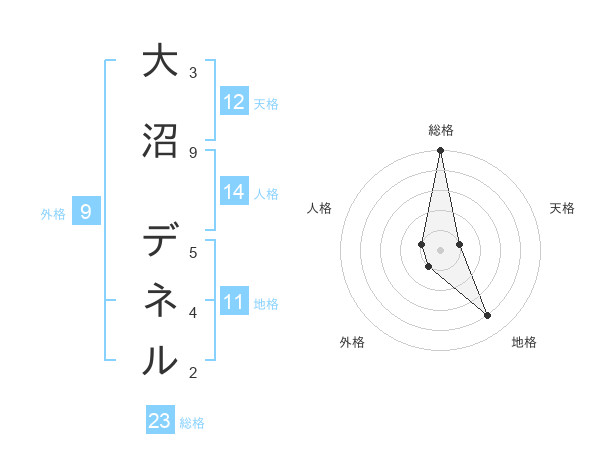 大沼 デネルさんを姓名の画数から五運を鑑定
