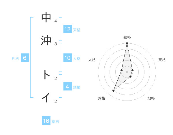 中沖 トイさんの総格は16画の5点!
