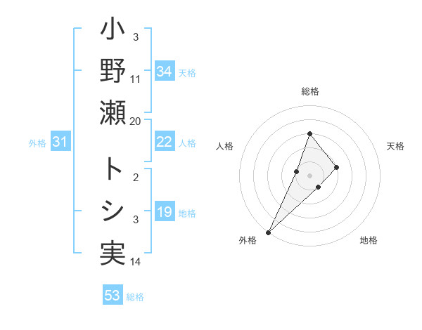 小野瀬 トシ実さんの総格は53画の3点!