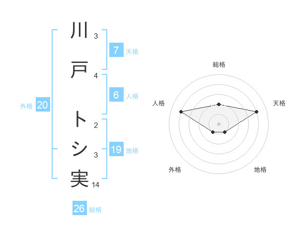 川戸 トシ実さんを姓名の画数から五運を鑑定