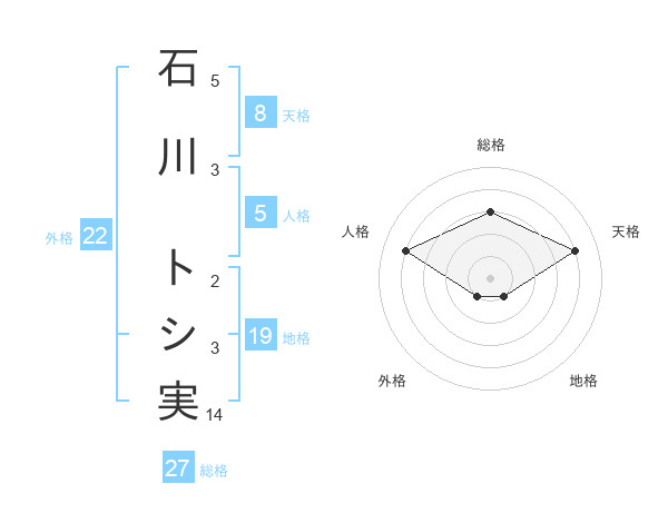 石川 トシ実さんを姓名の画数から五運を鑑定