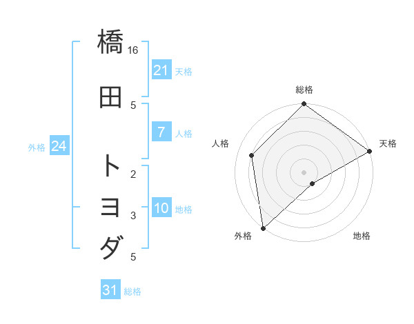 橋田 トヨダさんの天格は21画の5点!