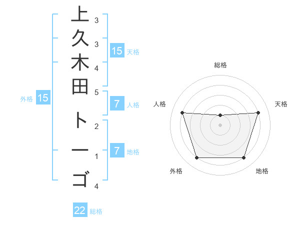 上久木田 トーゴさんを姓名の画数から五運を鑑定