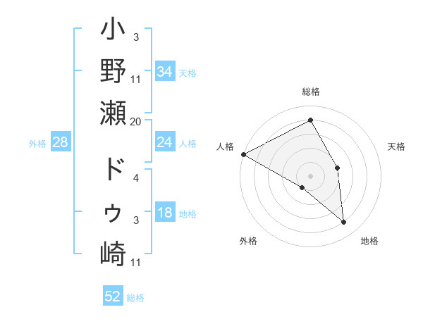小野瀬 ドゥ崎さんの総格は52画の4点!