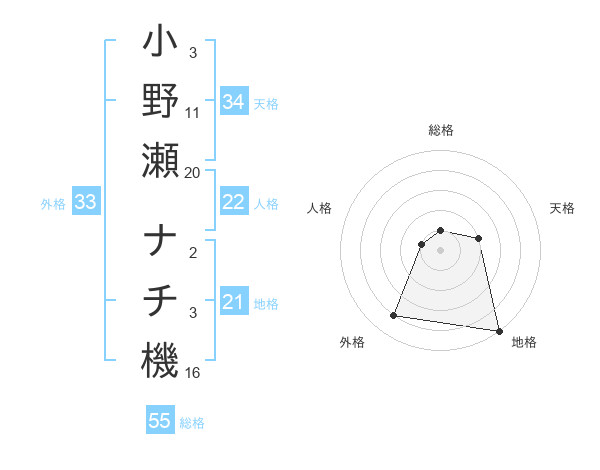 小野瀬 ナチ機さんの総格は55画の1点!