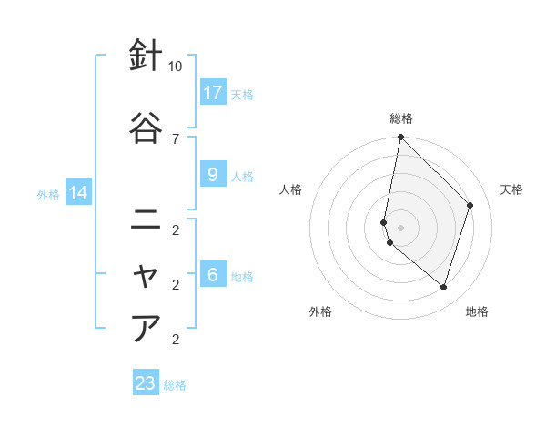 針谷 ニャアさんを姓名の画数から五運を鑑定