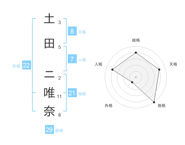 土田 ニ唯奈さんの地格は21画の5点!
