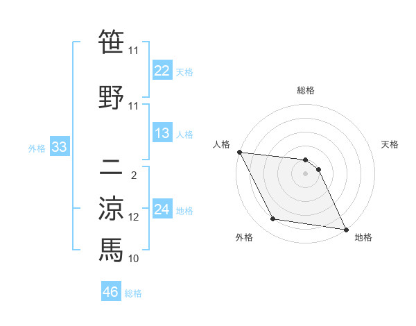 笹野 ニ涼馬さんを姓名の画数から五運を鑑定