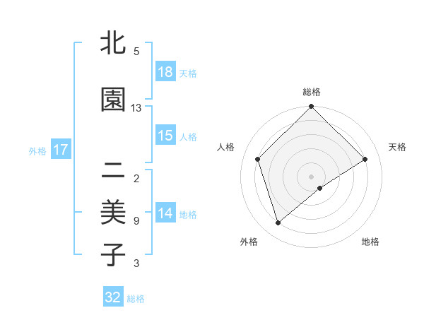 北園 ニ美子さんを姓名の画数から五運を鑑定
