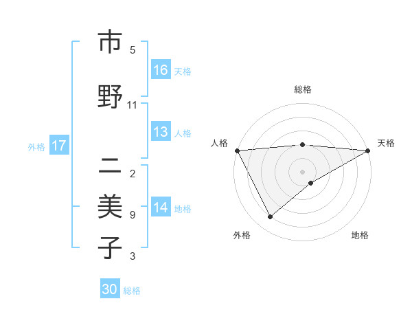市野 ニ美子さんを姓名の画数から五運を鑑定