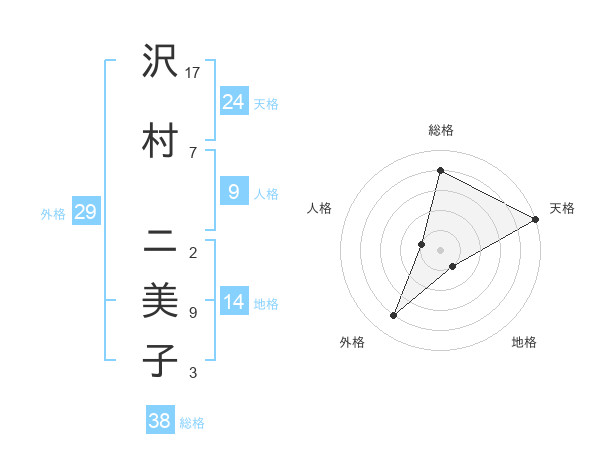 沢村 ニ美子さんの総格は38画の4点!