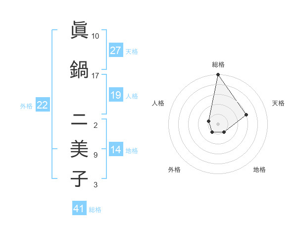 眞鍋 ニ美子さんの総格は41画の5点!