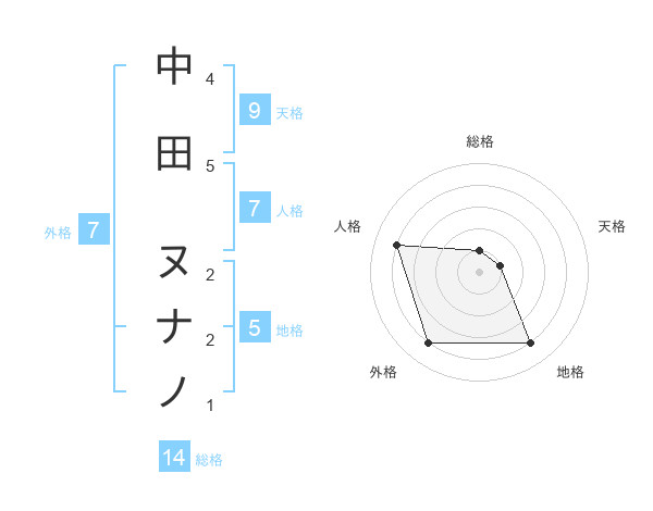中田 ヌナノさんを姓名の画数から五運を鑑定