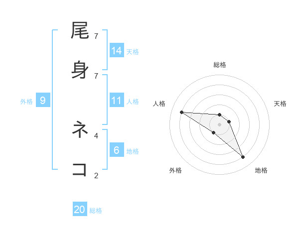 尾身 ネコさんの総格は20画の1点!