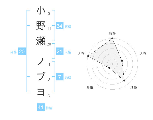 小野瀬 ノブヨさんを姓名の画数から五運を鑑定