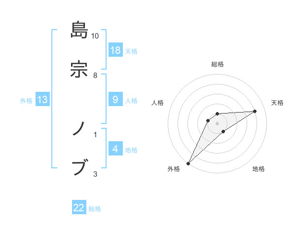 島宗 ノブさんを姓名の画数から五運を鑑定
