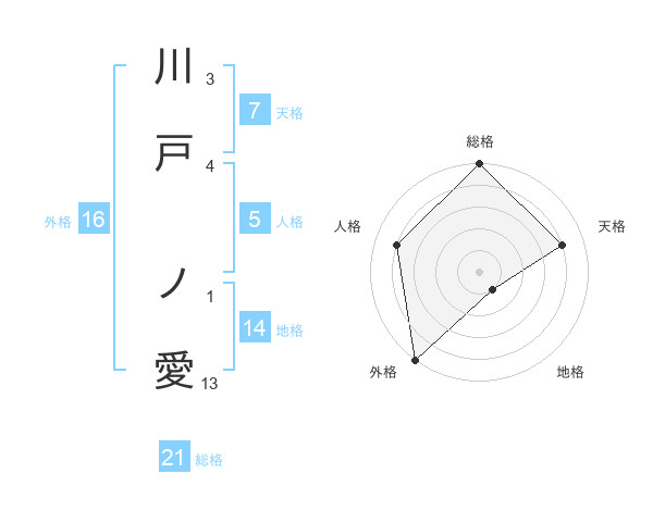 川戸 ノ愛さんを姓名の画数から五運を鑑定
