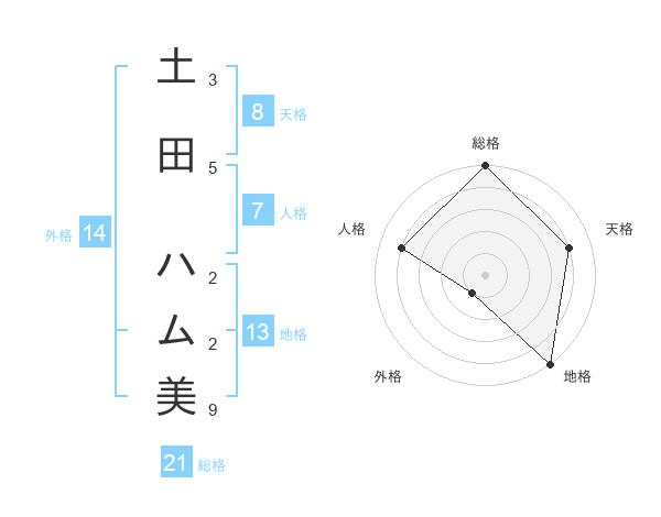 土田 ハム美さんを姓名の画数から五運を鑑定