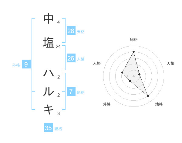 中塩 ハルキさんの総格は35画の4点!