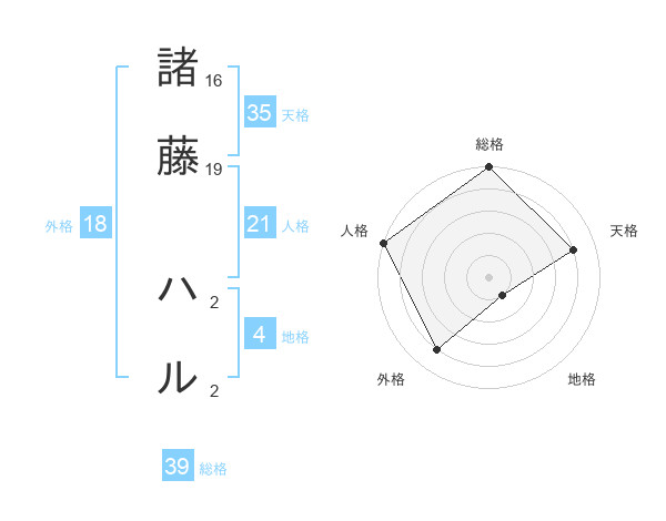 諸藤 ハルさんの総格は39画の5点!