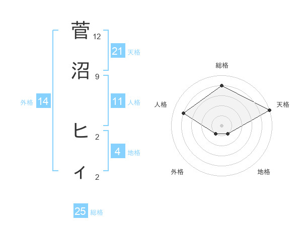 菅沼 ヒィさんの天格は21画の5点!