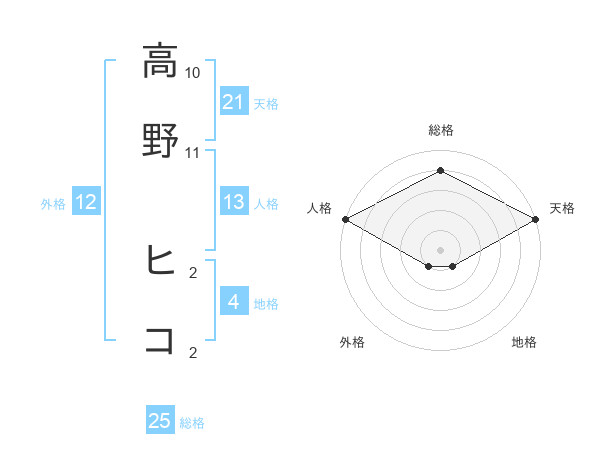 高野 ヒコさんの天格は21画の5点!