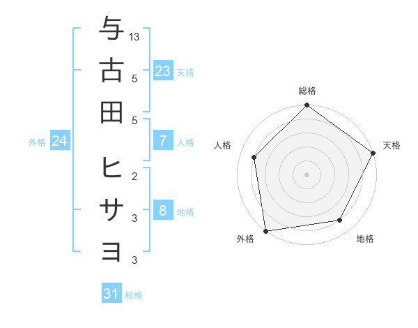 与古田 ヒサヨさんの天格は23画の5点!