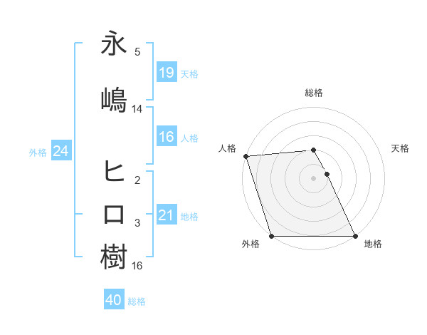 永嶋 ヒロ樹さんの外格は24画の5点!