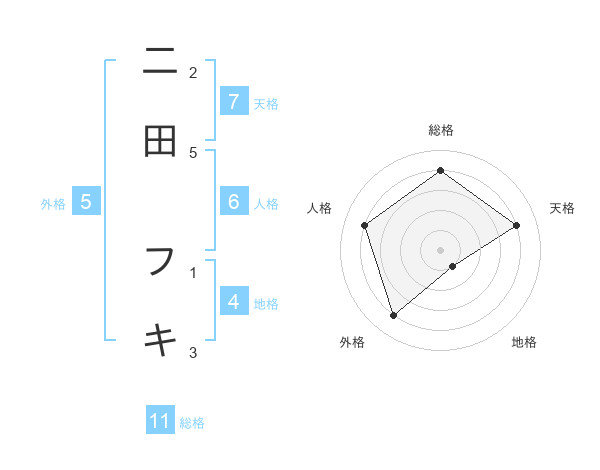 二田 フキさんの総格は11画の4点!