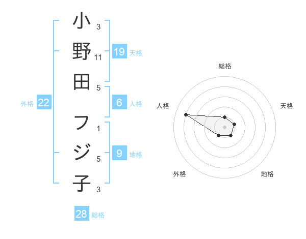 小野田 フジ子さんを姓名の画数から五運を鑑定