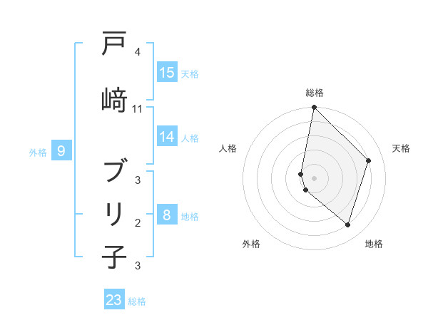 戸﨑 ブリ子さんを姓名の画数から五運を鑑定