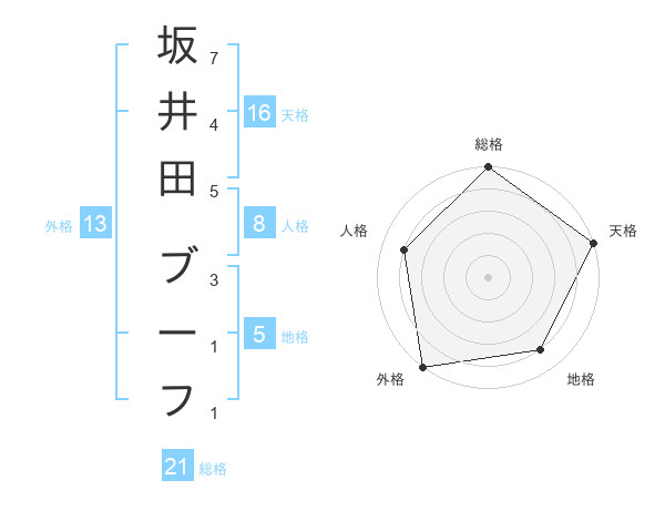坂井田 ブーフさんを姓名の画数から五運を鑑定
