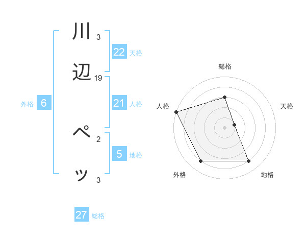 川辺 ペッさんを姓名の画数から五運を鑑定
