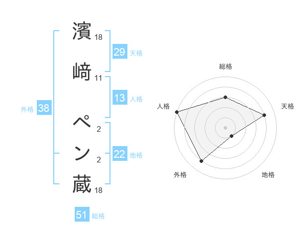 濱﨑 ペン蔵さんの総格は51画の3点!