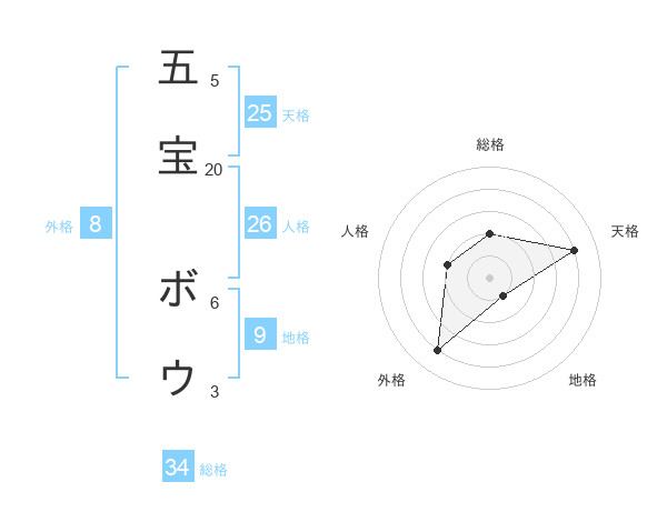 五宝 ボウさんの総格は34画の2点!