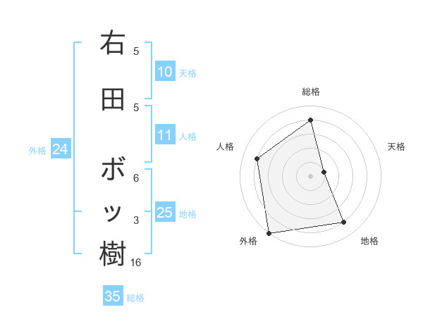 右田 ボッ樹さんの総格は35画の4点!