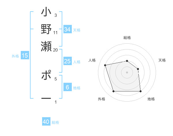 小野瀬 ポーさんを姓名の画数から五運を鑑定