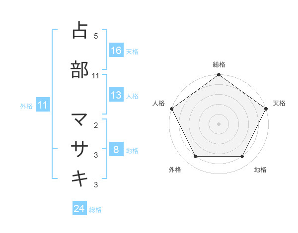 占部 マサキさんの天格は16画の5点!