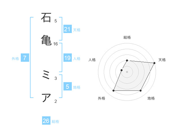 石亀 ミアさんを姓名の画数から五運を鑑定