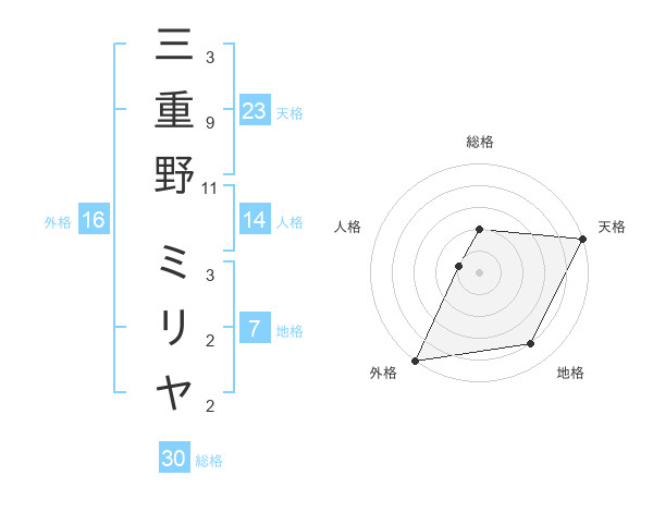 三重野 ミリヤさんの外格は16画の5点!