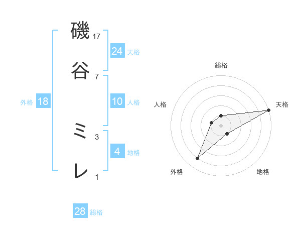 磯谷 ミレさんの天格は24画の5点!