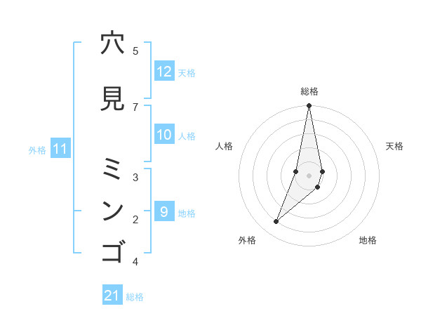 穴見 ミンゴさんの総格は21画の5点!