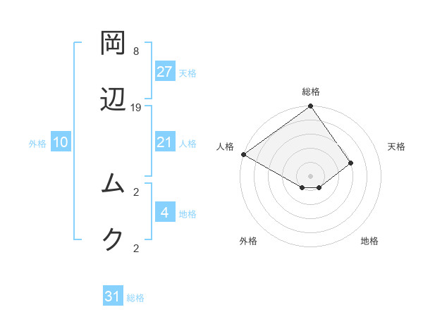 岡辺 ムクさんの総格は31画の5点!
