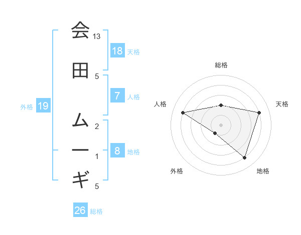 会田 ムーギさんを姓名の画数から五運を鑑定
