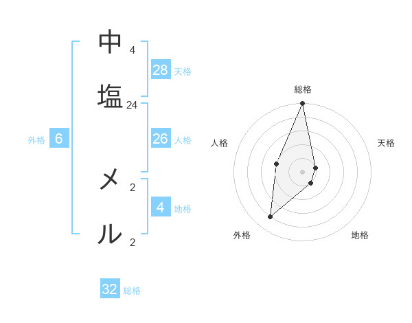 中塩 メルさんの総格は32画の5点!