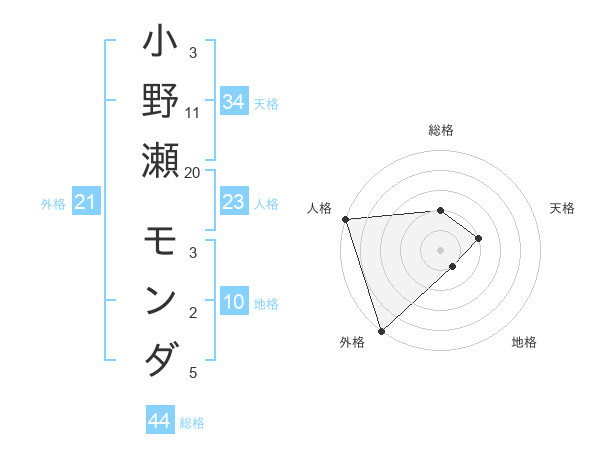小野瀬 モンダさんを姓名の画数から五運を鑑定