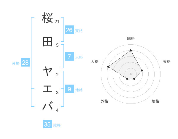 桜田 ヤエバさんを姓名の画数から五運を鑑定