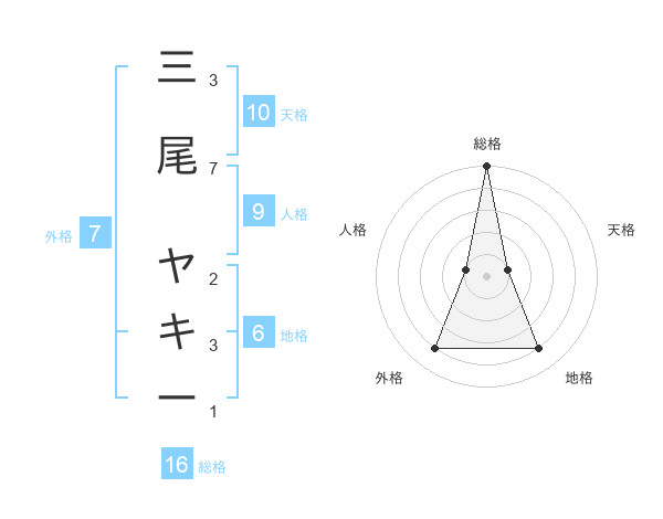 三尾 ヤキーさんを姓名の画数から五運を鑑定