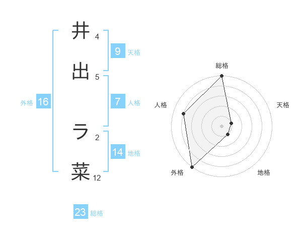 井出 ラ菜さんを姓名の画数から五運を鑑定