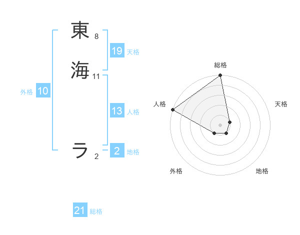東海 ラさんの総格は21画の5点!